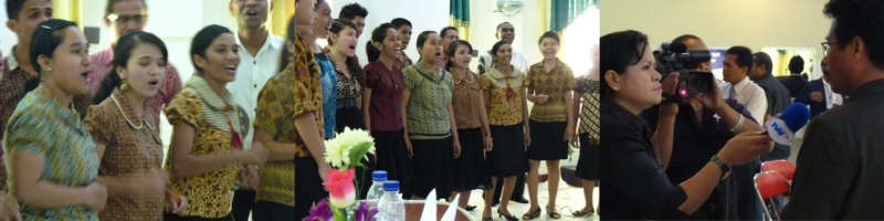 Left: UNDANA's Bella Cantare choir group performed following the opening and closing of the workshop activities. Right: Interviewed by TVRI (the Indonesian TV news) Prof. Frans Umbu Datta speaks about the joint workshop